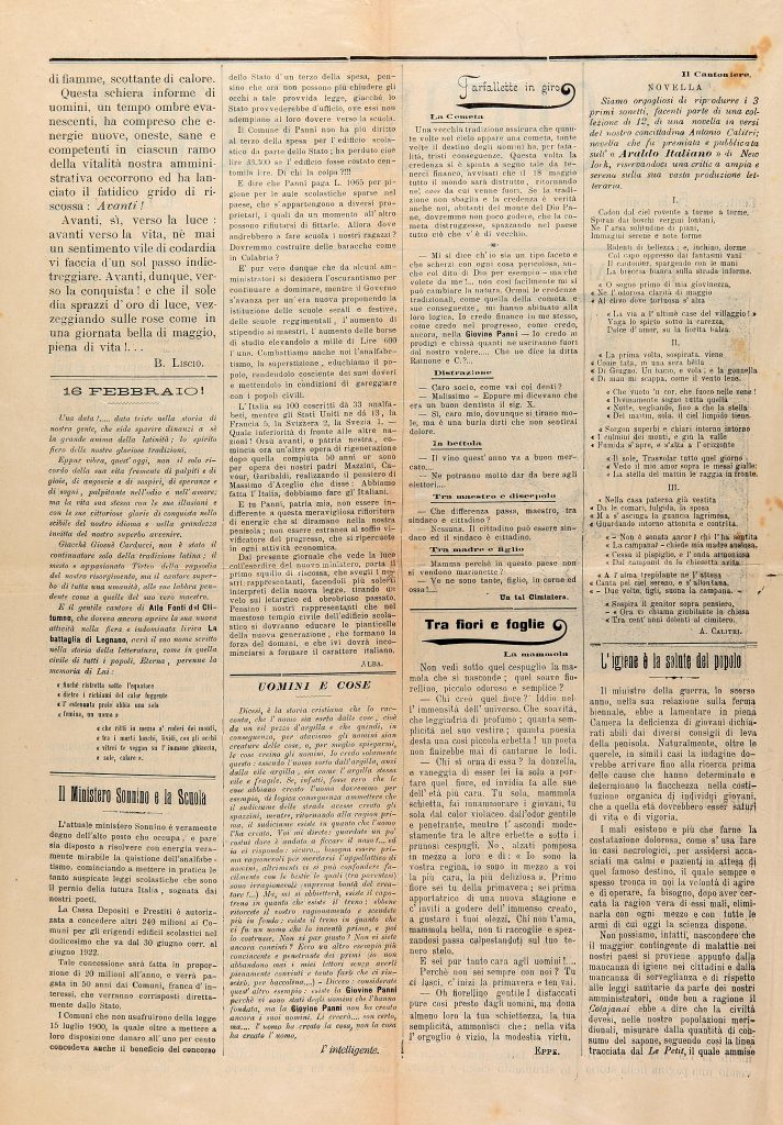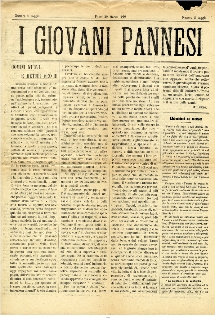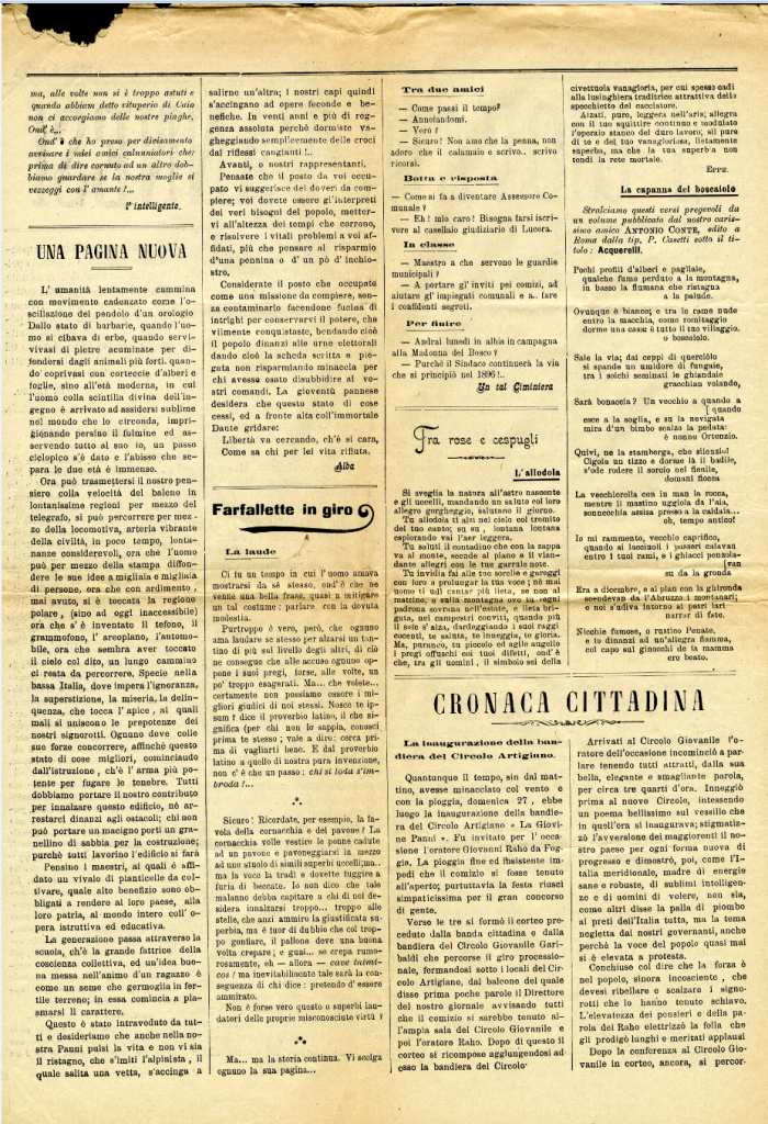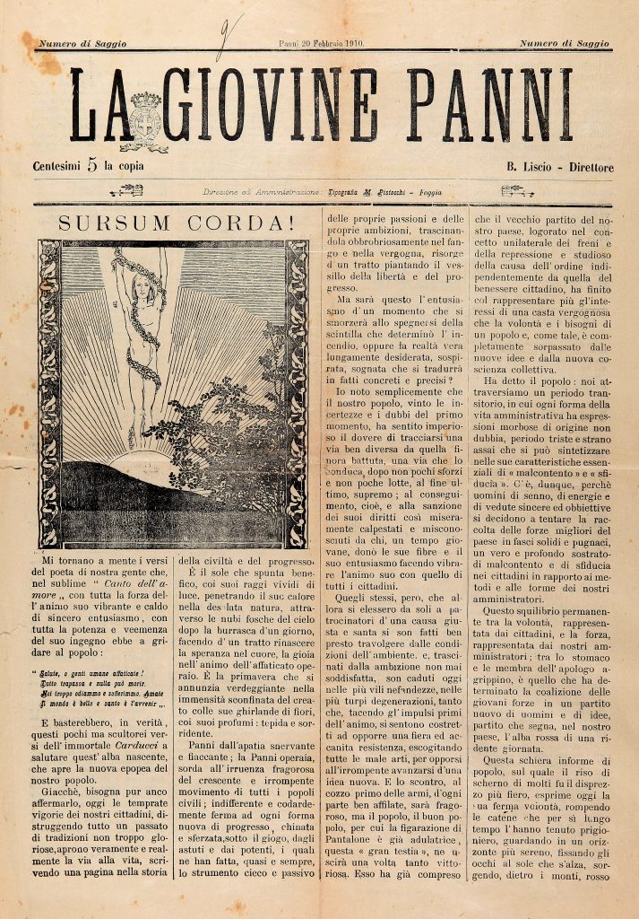 Rotocalco in folio dell’omonimo circolo degli artigiani, della cui redazione fanno parte giovani studenti di Panni. E’ sostenuto economicamente dai pannesi emigrati negli USA. I primi due numeri escono in saggio con titoli diversi: I Giovani Pannesi e Panni risorta “per isfuggire alle prescritte formalità di legge cui è subordinata la stampa periodica”.Per qualche tempo se ne sospende la pubblicazione, ma il 17 luglio 1910 ricompare con il n. 7. Il sindaco più volte attaccato ne chiede la revoca della diffusione.