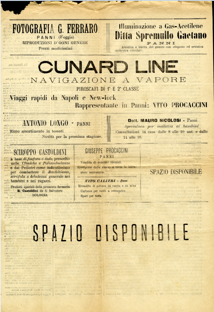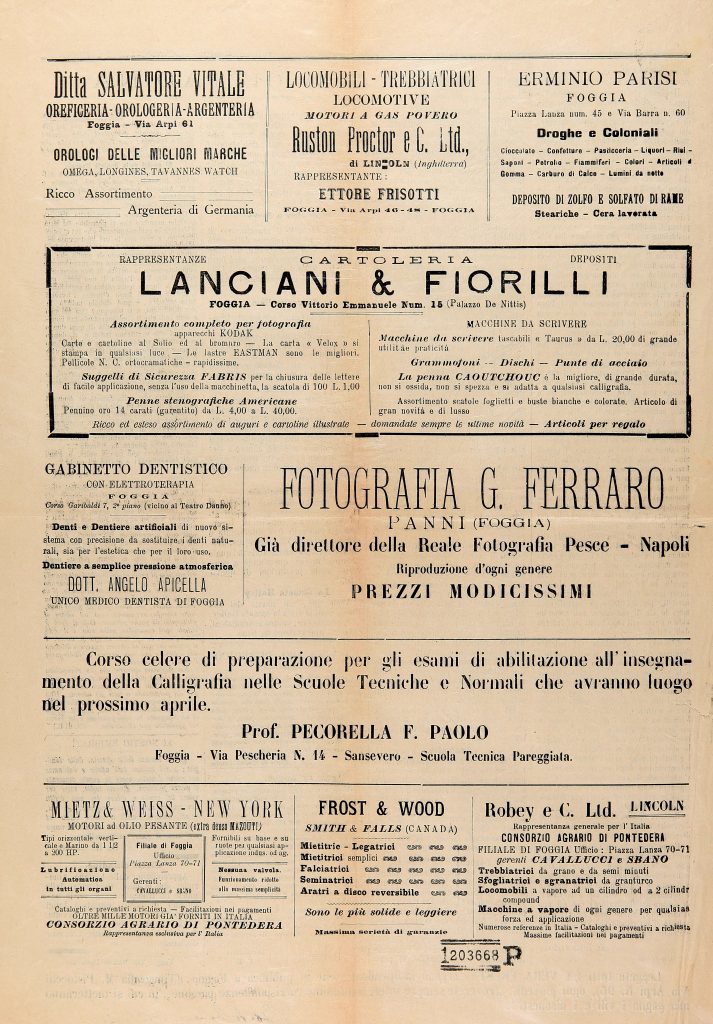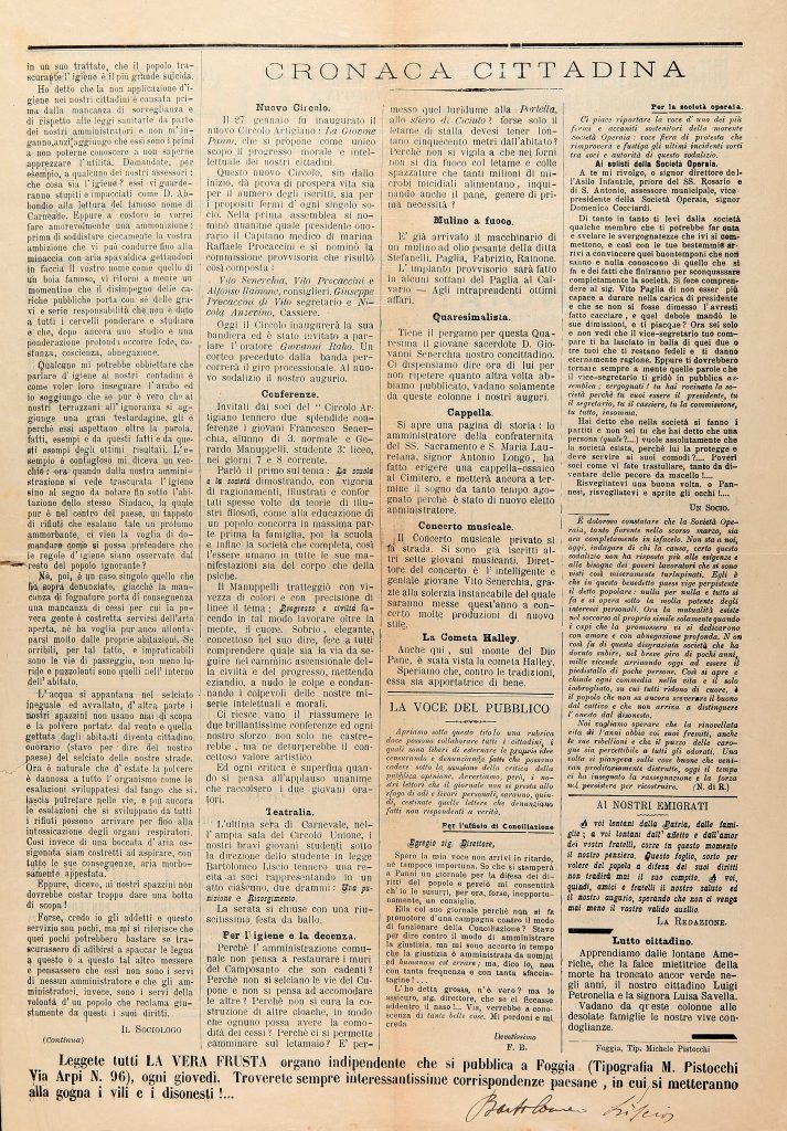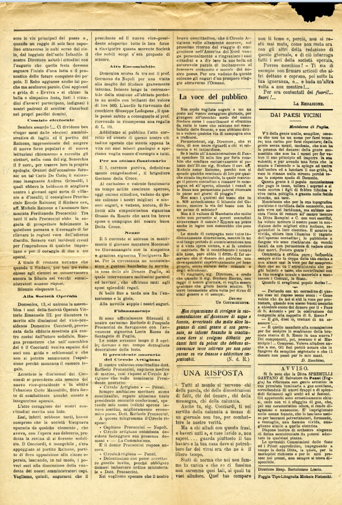Periodico settimanale – Direzione e amministrazione: Bartolomeo Liscio – Foggia, Tipografia Michele Pistocchi via Arpi, 96.